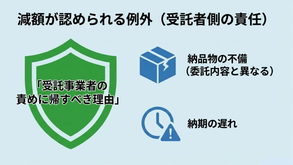 一方で、行為としては「減ずる」にあたるけれども、例外として許されるケースもあります。それは、「中小受託事業者の責めに帰すべき理由」がある場合です。