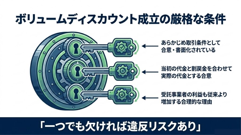 一定期間に多量の発注を行ったことによる、ボリュームディスカウントについては、現状、唯一認められているケースとして、そもそも禁止されている「減額」という行為自体にあたらない(=非該当である)とされています。