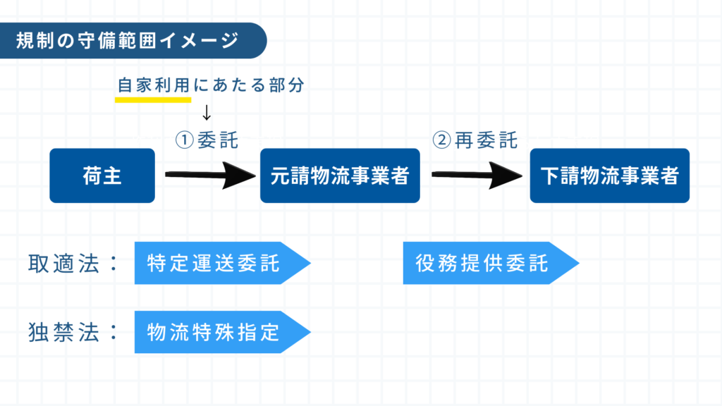 そのため、①荷主から元請物流事業者への直接委託(自家利用にあたる部分)と②元請から下請物流事業者への再委託のどちらについても適用があります。
